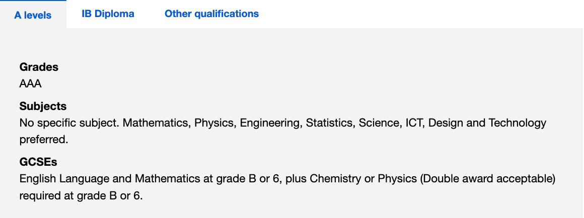 ❍ A-Level:AAA,无特定科目要求,数学、物理、工程、统计、科学、信息通信技术、设计与技术等科目优先。