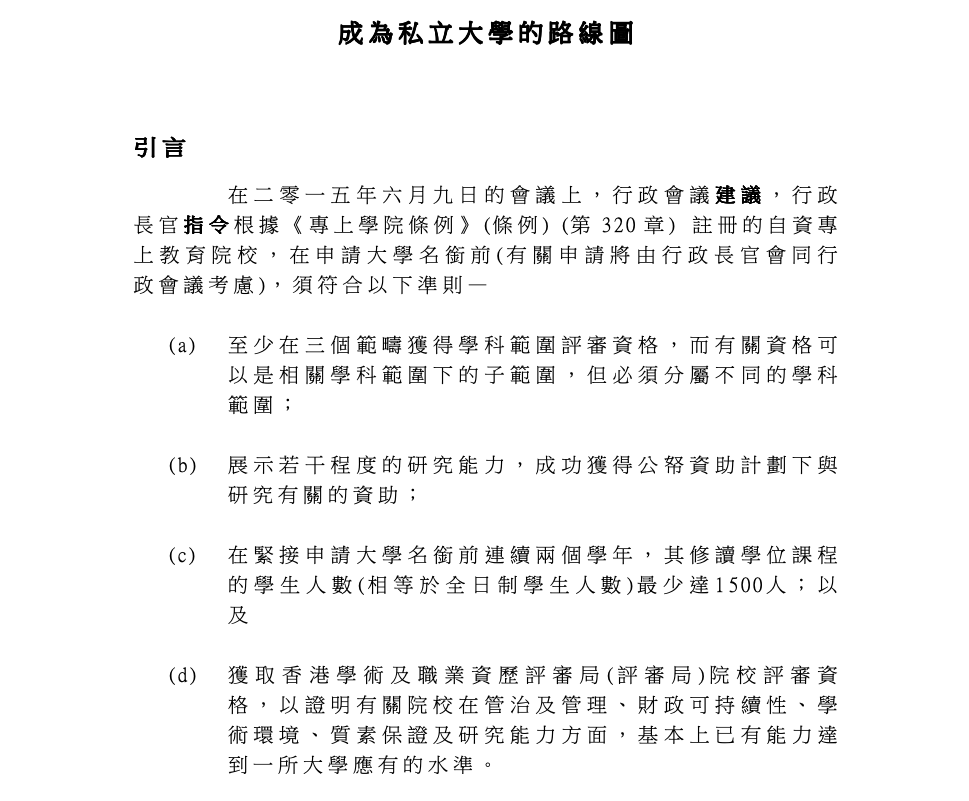 在香港,一所自资专上院校想升格为“大学”,并不是改个名字那么简单。从学术水平、科研实力,到师资规模、财政状况,每一项都有明确且严格的要求。比如,学生规模须连续两学年达到至少1500名学位课程学生(按全日制折算)。可以说,香港对“大学”这块招牌的审核,一向审慎而严谨。