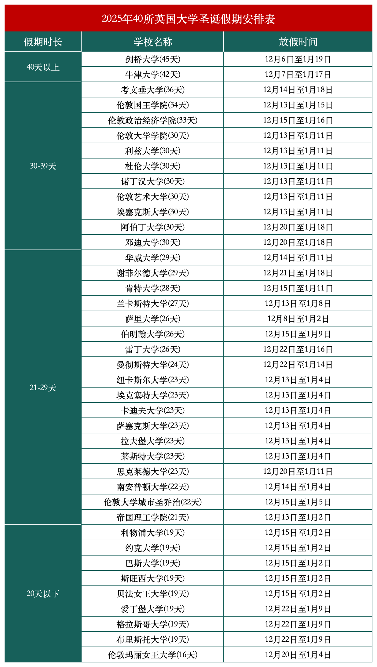 今年英国各高校的圣诞假期长度,可谓“旱的旱死,涝的涝死”。我们整理了40所热门大学的安排,发现假期从16天到45天不等,相差足足近一个月!